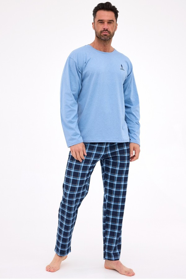 Pijama pentru barbati realizata din bumbac de inalta calitate, compusa din 2 piese. Bluza este confectionata din tesatura melanj, are maneca lunga, decolteu rotund si este infrumusetata in zona pieptului cu un imprimeu mic cu un arbore sequoia, iar pantalonul este lung, are talie elastica confortabila si prezinta model deosebit cu carouri.