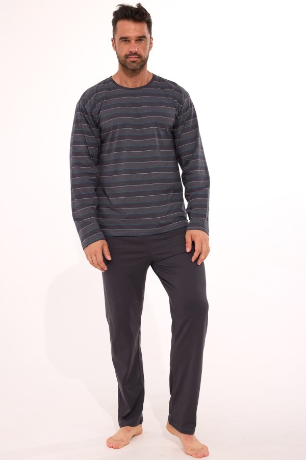 Pijama pentru barbati realizata din bumbac de inalta calitate, compusa din 2 piese. Bluza are maneca lunga, decolteu rotund finisat cu insertie de material in nuanta pantalonului si prezinta model deosebit cu dungi, iar pantalonul este lung, uni.