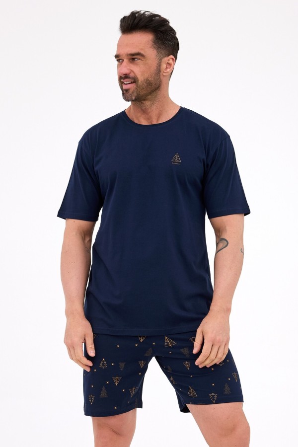 Pijama pentru barbati realizata din bumbac de inalta calitate, compusa din 2 piese. Bluza are maneca scurta, decolteu rotund si este infrumusetata in zona pieptului cu un imprimeu mic cu un brad, precum si cu inscriptii subtile, iar pantalonul este scurt, are talie elastica confortabila si prezinta model auriu deosebit cu brazi.