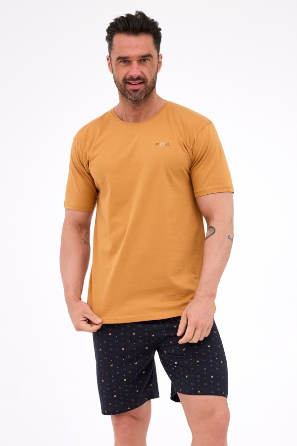 Pijama pentru barbati realizata din bumbac de inalta calitate. Pijamaua este compusa din 2 piese. Bluza are maneca scurta, decolteu rotund si este infrumusetata in zona pieptului cu inscriptia "Fox", iar pantalonul este scurt, are talie elastica confortabila si prezinta model deosebit cu capete de vulpi.