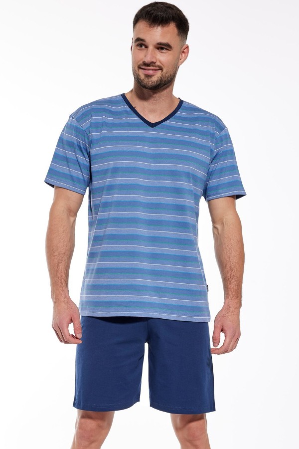 Pijama pentru barbati realizata din bumbac de inalta calitate. Pijamaua este compusa din 2 piese. Bluza are maneca scurta, decolteu in V finisat cu insertie de material in nuanta pantalonului si prezinta model cu dungi colorate, iar pantalonul este scurt, uni si are talie elastica confortabila.