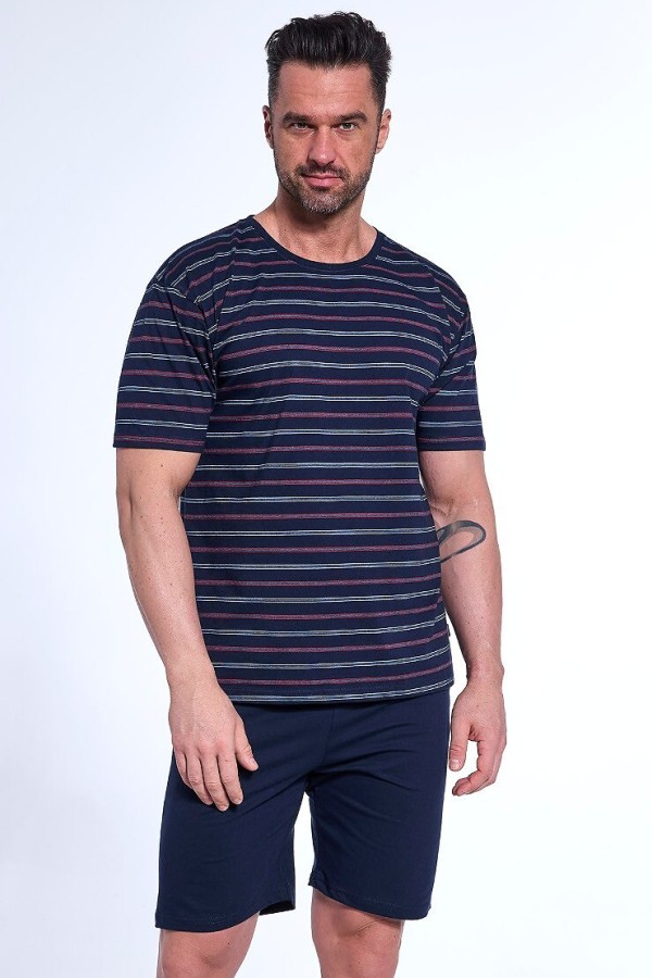 Pijama pentru barbati realizata din bumbac de inalta calitate. Pijamaua este compusa din 2 piese. Bluza are maneca scurta, decolteu rotund finisat cu insertie de material in nuanta pantalonului si prezinta model deosebit cu dungi colorate, iar pantalonul este scurt, uni si are talie elastica confortabila.