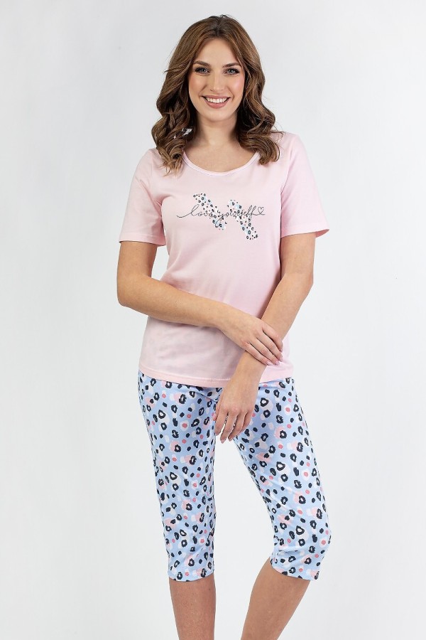 Pijama de dama realizata din bumbac de inalta calitate. Pijamaua este compusa din 2 piese. Bluza are maneca scurta, decolteu semirotund si este infrumusetata pe partea frontala cu un imprimeu interesant, precum si cu inscriptia "Love yoursef", iar pantalonul este 3/4, are talie elastica confortabila si prezinta model animal print.